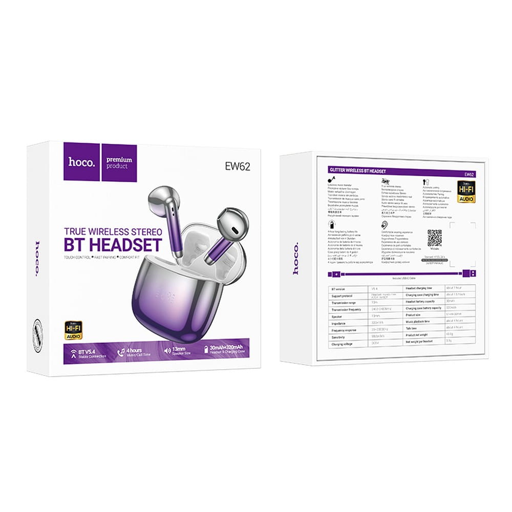 Hoco EW62 TWS to fioletowe, bezprzewodowe słuchawki dokanałowe z Bluetooth 5.4, oferujące nowoczesny design, wysoką jakość dźwięku oraz komfort użytkowania dzięki ergonomicznej konstrukcji i funkcji niezależnego używania każdej słuchawki.